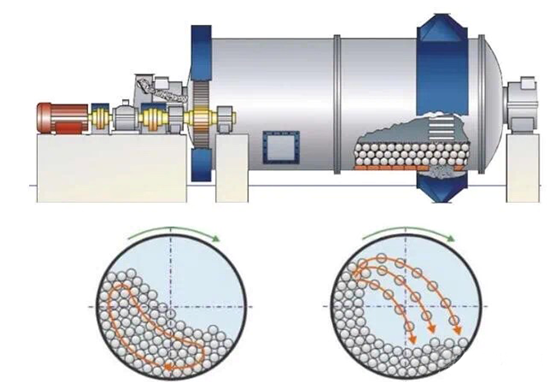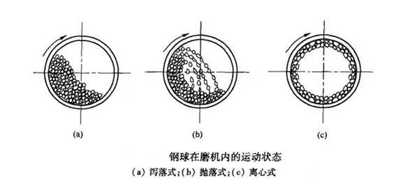 球磨机是选矿设备中常用的设备之一。转速是球磨机设计和操作的主要参数之一,转速大小直接决定着筒体内磨矿介质的运动状态和磨矿作业的效果。转速过快或过慢都会减弱或失去粉碎作用。本文介绍不同转速下不同的磨矿作用效果。