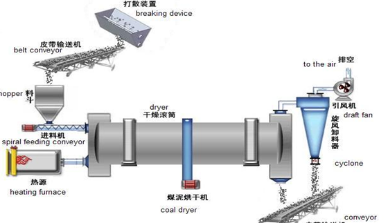 干燥的湿物料由皮带输送机或斗式提升机送到料斗,然后经料斗的加料机通过加料管道进入加料端。加料管道的斜度要大于物料的自然倾角,以便物料顺利流入干燥器内。干燥器圆筒是一个与水平线略成倾斜的旋转圆筒,物料从较高一端加入,载热体由低端进入,与物料成逆流接触,也有载热体和物料一起并流进入筒体的,随着圆筒的转动物料受重力作用运行到较底的一端。